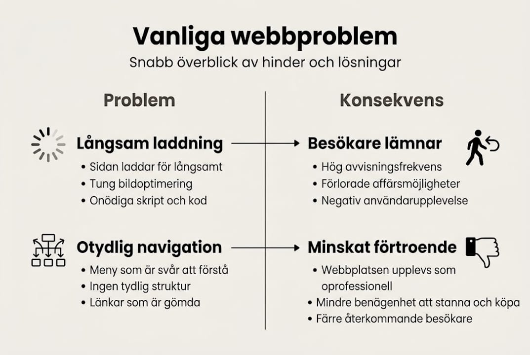 De vanligaste problemen vi ser hos bygg- och hantverksföretag är svår navigation, otydliga kontaktvägar och bilder som gör sidan seg. Tydliga presentationssidor och bra navigation ökar konverteringen, det vill säga andelen besökare som faktiskt tar kontakt.